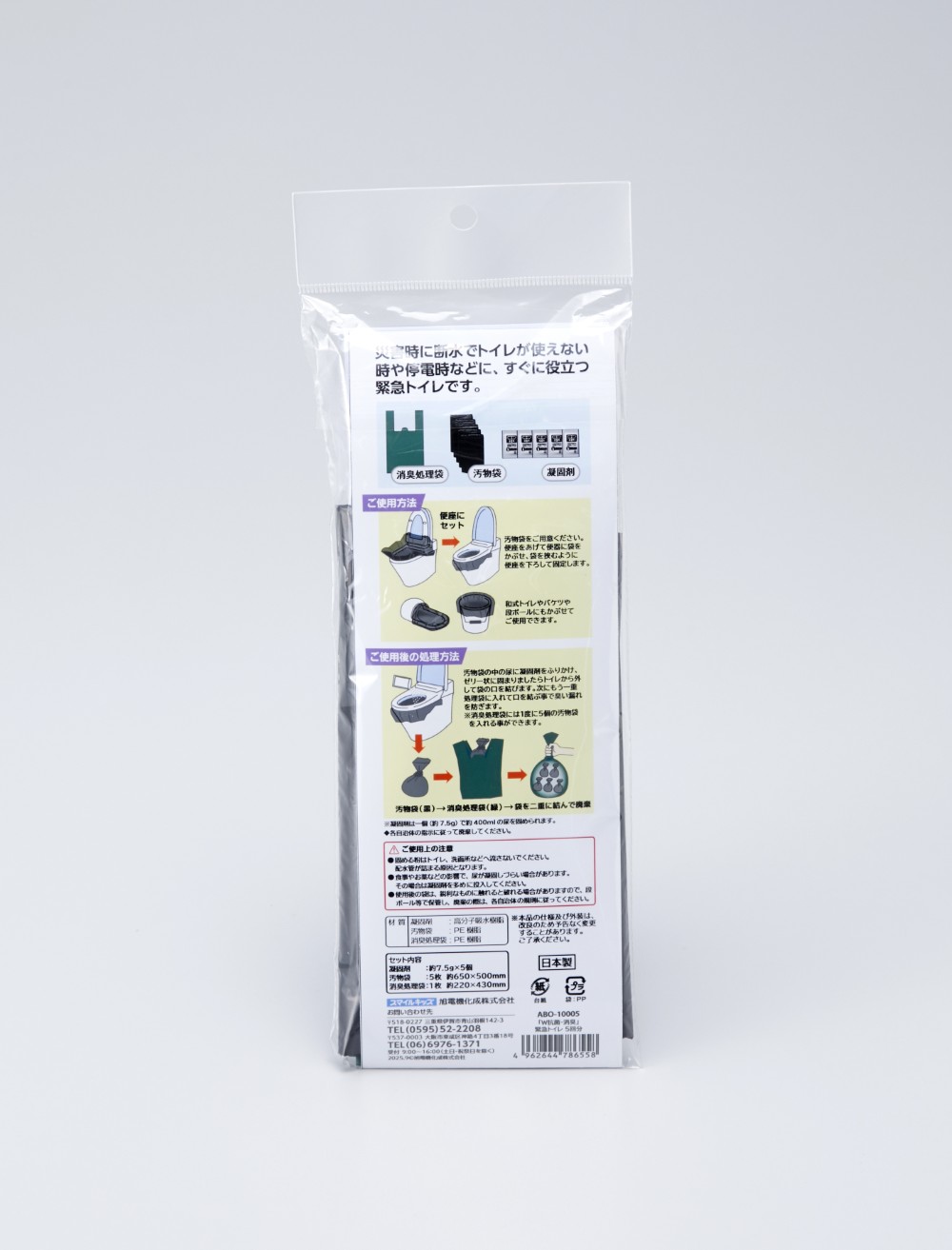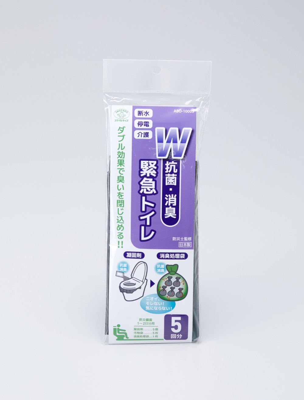 凝固剤・処理袋共に第三者機関での厳しい抗菌・消臭試験をクリアしている高機能タイプの緊急トイレです。