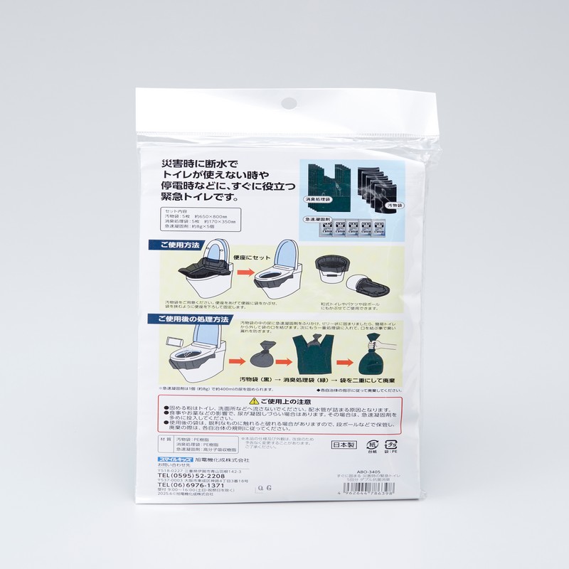 断水・停電時などの緊急時に水なしで使える簡易トイレです。凝固剤・処理袋共に第三者機関での厳しい抗菌・消臭試験をクリアしている高機能タイプの緊急トイレです。