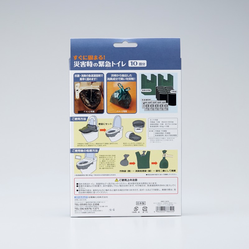 断水・停電時などの緊急時に水なしで使える簡易トイレです。凝固剤・処理袋共に第三者機関での厳しい抗菌・消臭試験をクリアしている高機能タイプの緊急トイレです。
