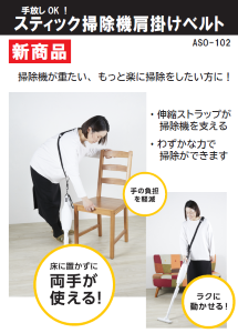 スティック型掃除機に取り付けることで、手を放して家具を移動できたり別の作業が出来るベルトです。伸縮ストラップが掃除機を支えることで軽く握り楽な力で掃除機をかける事が出来ます。不安定なまま壁にかけたりスタンドまで戻ることなくスムーズな掃除を実現します。